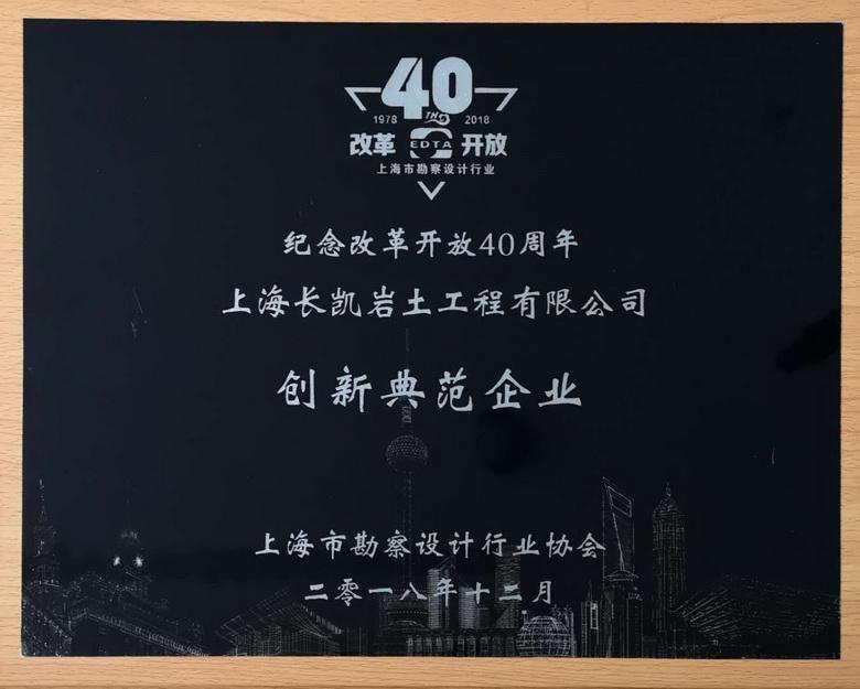 会上,协会对改革开放40年来作出突出贡献的建设企业与个人进行了表彰。其中,长凯岩土荣获“上海市勘察设计行业纪念改革开放40周年创新典范企业”荣誉称号。
