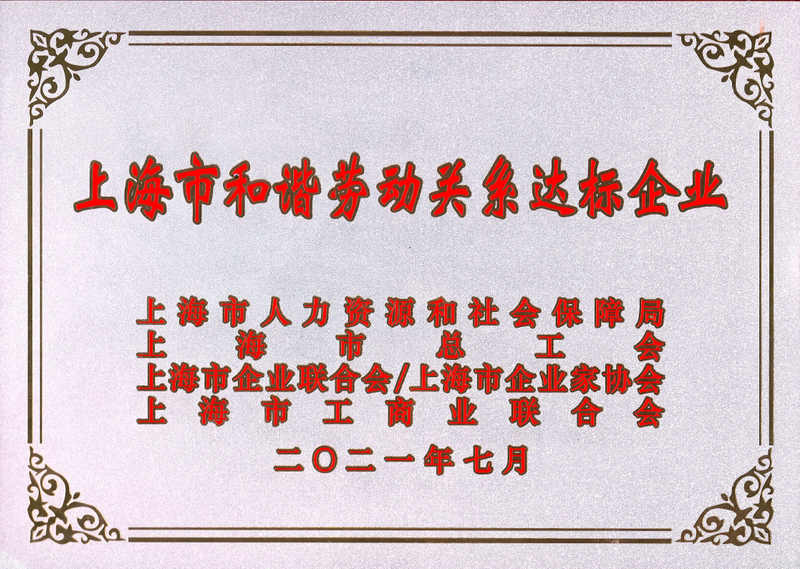 近日,公司荣获上海市人力资源和社会保障局、上海市总工会、上海市企业联合会/上海市企业家协会、上海市工商业联合会共同授予“上海市和谐劳动关系达标企业”荣誉称号。